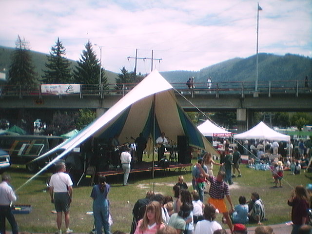 Today we walked along a self-guided path among the historical landmarks of Missoula -- not the buildings themselves but plaques which describe the various areas, buildings, rivers, and history of the town. After dropping our bikes off at the Big Sky bicycle shop for some wheel truing and re-lubing, and a quick mocha for us, we hiked back to the university and started on the path. We crossed the Higgins Bridge into downtown for the "Out to Lunch" music and food festival, a weekly happening which really gets a lot of locals out every wednesday for socializing and food-tasting and general relaxation. We then got a couple of other things for the camping (citronella bug spray, a better bathroom-stuff bag for me, a headlamp for reading in the tent, and those folding thermarest-type chairs for days when there just aren't enough chairs for everyone) at a local outdoors store, wandered past the travelling Smithsonian Artrain, actually mailed some postcards to my old work group, took pictues of the Missoula Courthouse building and a street-eater. Then we finished the historical path, and got curbside shakes at the Big Dipper ice cream store while we rested our feet. Stairs are really hard to climb at this point -- we tire quickly, even though we can still pedal very well. It's muscle motion we haven't programmed in, I guess. Walked back to the dorms, and started editing day6-day10 while waiting for bikes to be finished. Around 6:30pm we went over to Big Sky and picked them up (they then added some nice soft foam stuff to my handlebars in my primary grip), rode them back in the rain, did 2 more loads of laundry, got pizza and soda for dinner, finished editing these pages (10:25pm), and packed up for an early start tomorrow -- we hear it'll be a 100+ mile day.