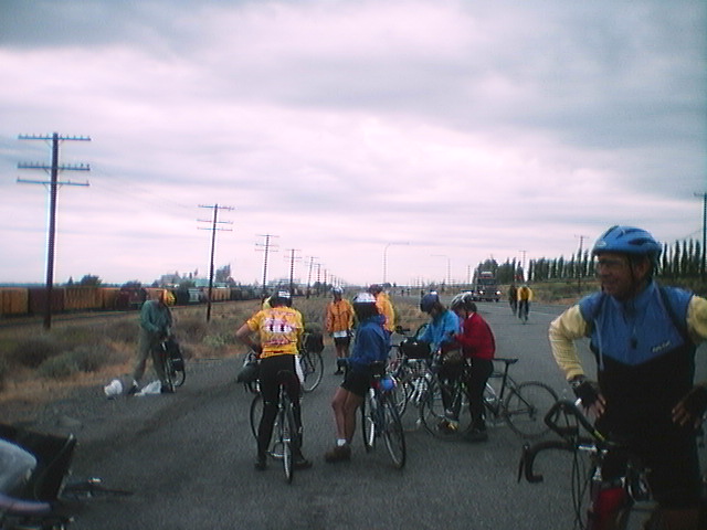The first stretch really sucked -- headwind the whole way to Pit 1. We did stop at several Historical Markers, though! The first was a stone marker for a Nez Perce chief (unfortunately, we can't read the name on the stone). The second was a sign for Fort Walla Walla, with the freight trains and the Snake River in the background. A second picture of the sign is actually legible. Several bikers stopped here, actually; the headwind was definitely something to rest from.